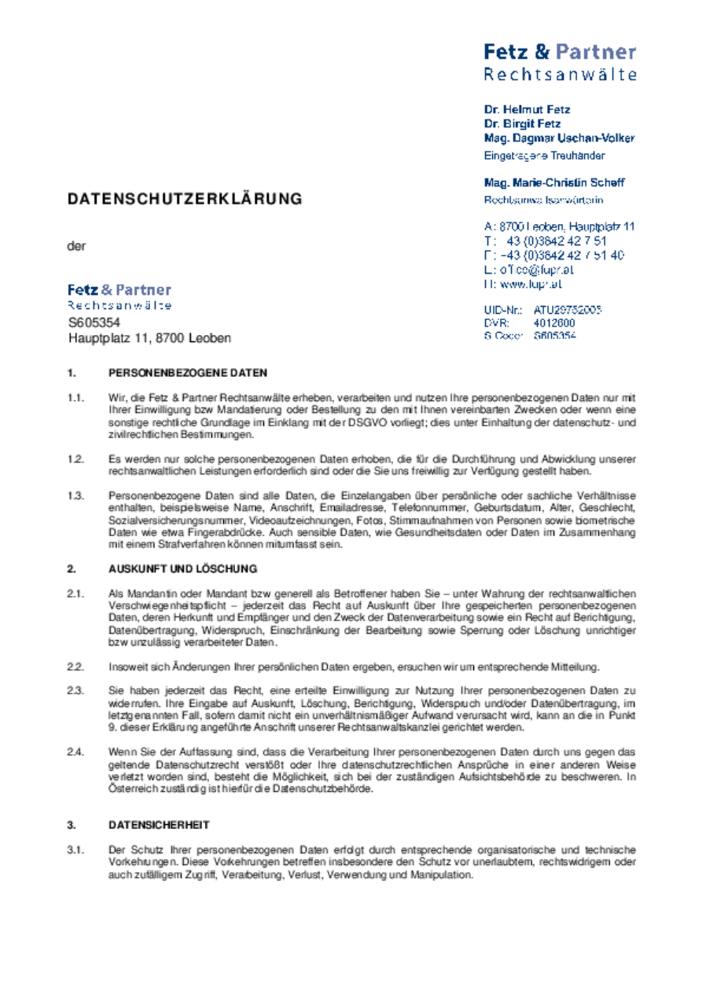 1.1. Wir, die Fetz & Partner Rechtsanwälte erheben, verarbeiten und nutzen Ihre personenbezogenen Daten nur mit Ihrer Einwilligung bzw Mandatierung oder Bestellung zu den mit Ihnen vereinbarten Zwecken oder wenn eine sonstige rechtliche Grundlage im Einklang mit der DSGVO vorliegt; dies unter Einhaltung der datenschutz- und zivilrechtlichen Bestimmungen.
